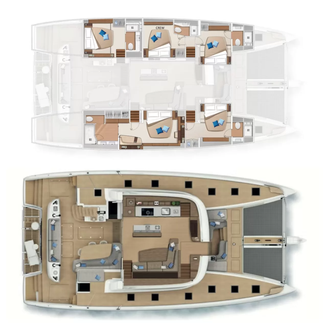 Accommodation includes four VIP cabins—1 King and 3 Queen cabins—with a custom enlarged Master cabin featuring a king bed and double-sized shower for ultimate comfort. The yacht’s layout includes spacious dining areas in the cockpit and expansive flybridge, complete with two bars, multiple sunning and shaded spots, and dual helm stations, perfect for entertaining and enjoying panoramic Caribbean views.