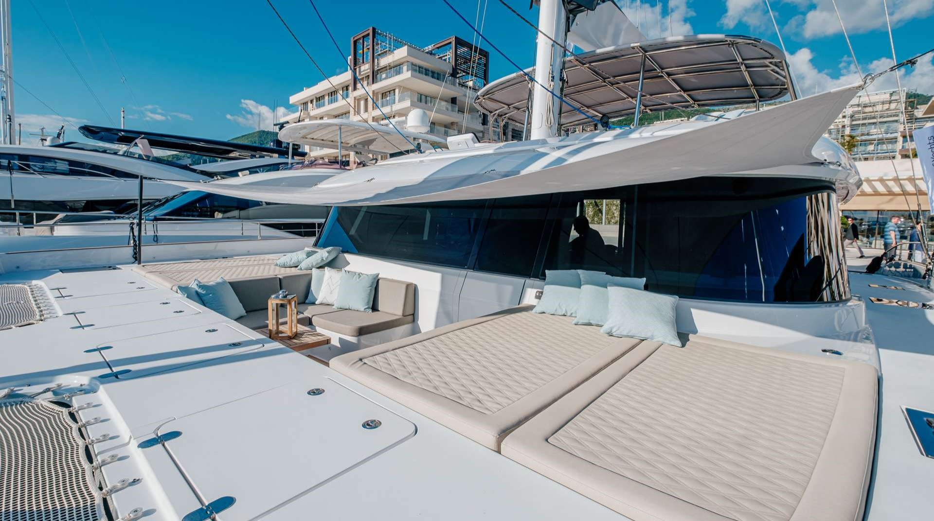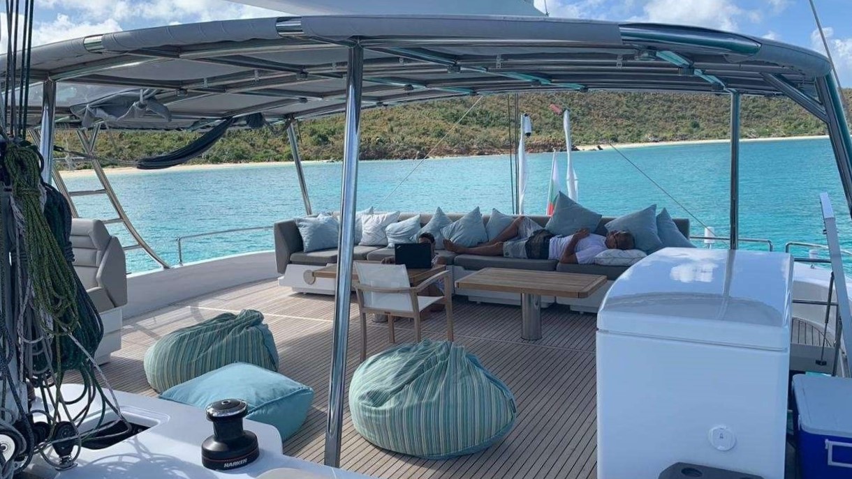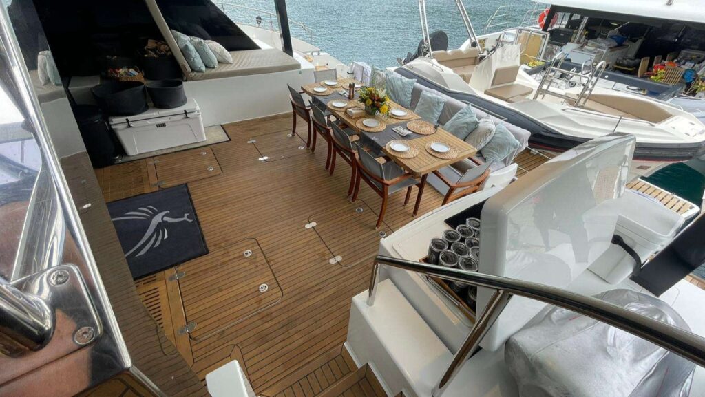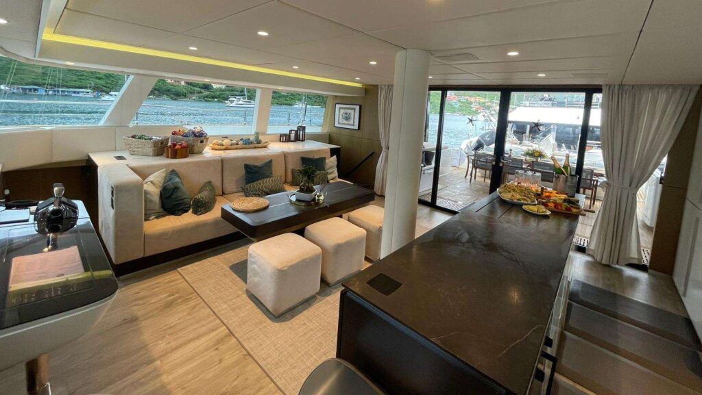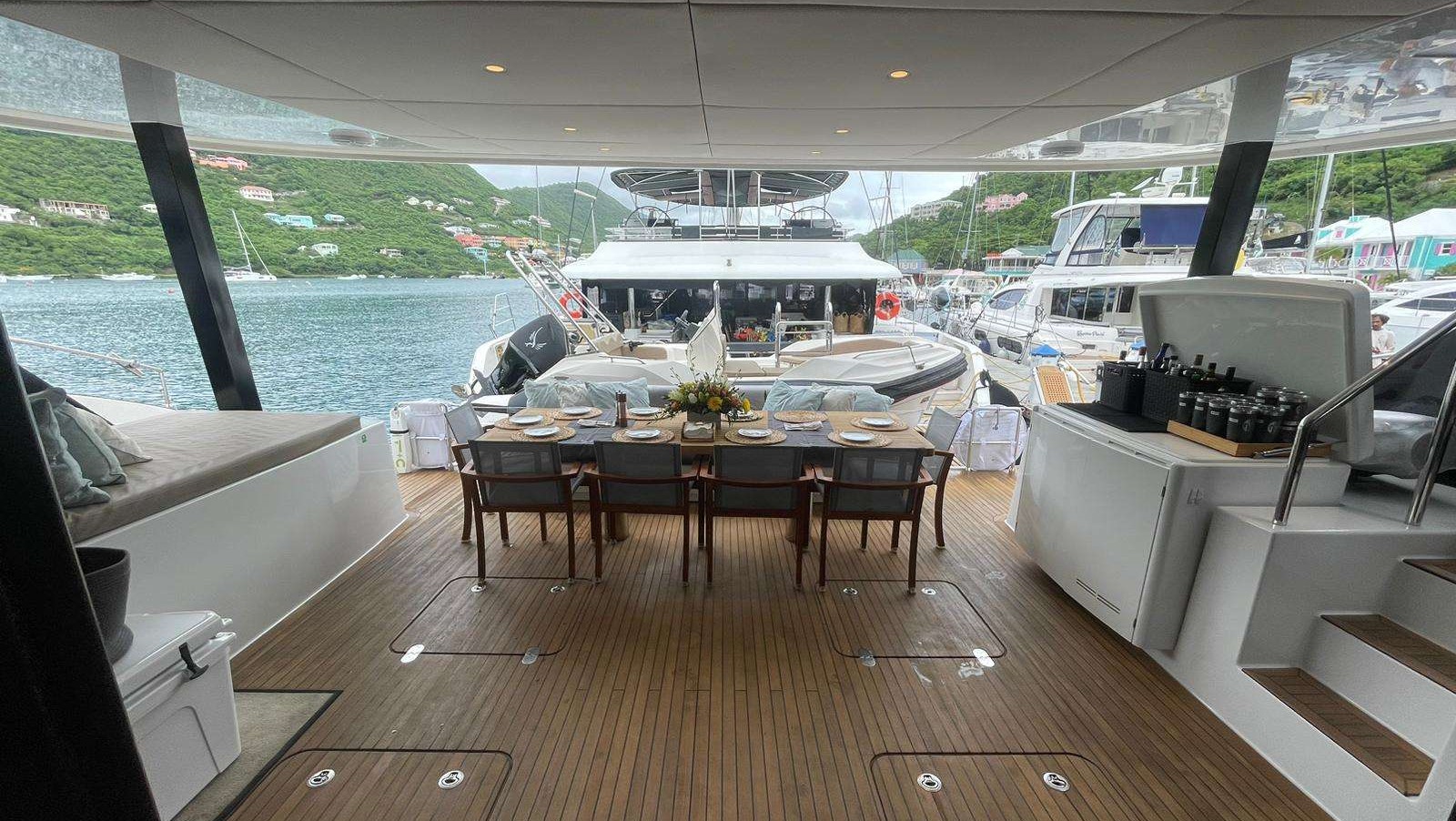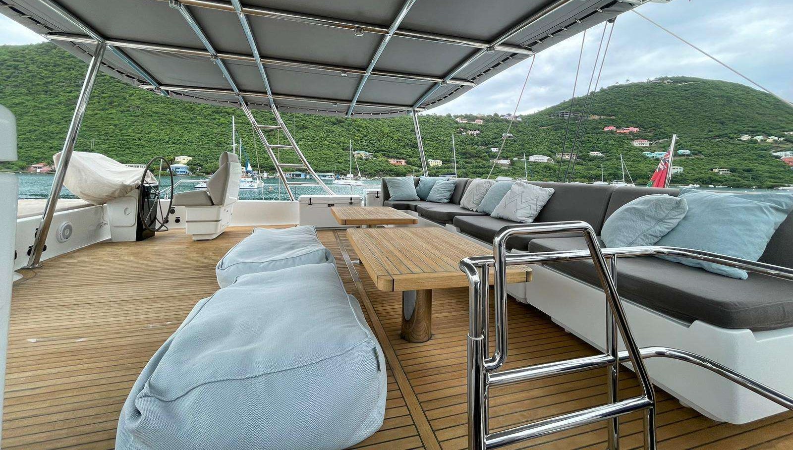 Outdoor spaces are designed for maximum enjoyment of the Caribbean lifestyle. The flybridge offers panoramic views, sun pads, pouffes, coffee tables, and a bar—perfect for relaxing afternoons or sunset cocktails. An additional bow terrace lounge provides a shaded retreat while still enjoying the sea breeze and scenery.