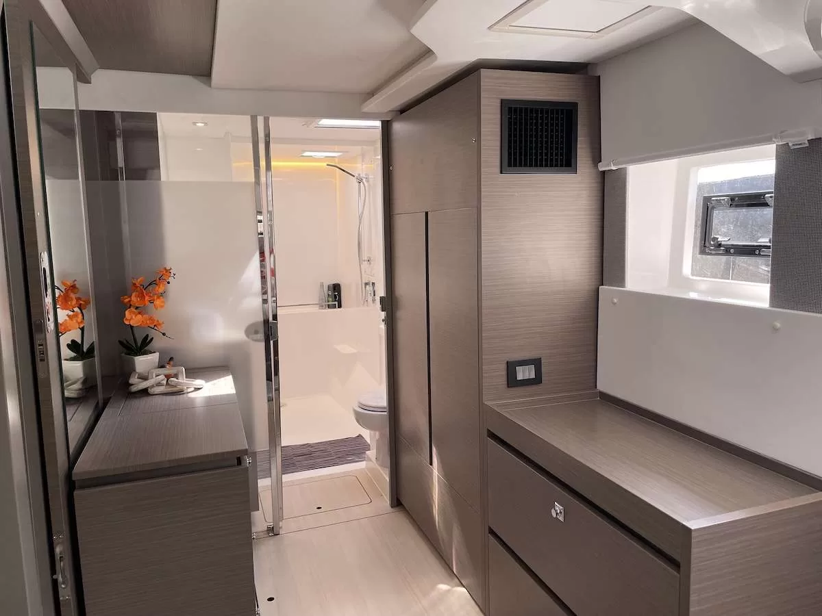 Step aboard REACH, a sophisticated Leopard 50 crewed sailing catamaran, offering luxury, comfort, and style in the Caribbean. Perfect for families, friends, or couples, REACH accommodates up to 8 guests in 4 queen cabins, each featuring ensuite baths with electric toilets, stall showers, and individual A/C controls. The master cabin offers a queen berth, vanity area, and direct access to the aft deck for private relaxation.