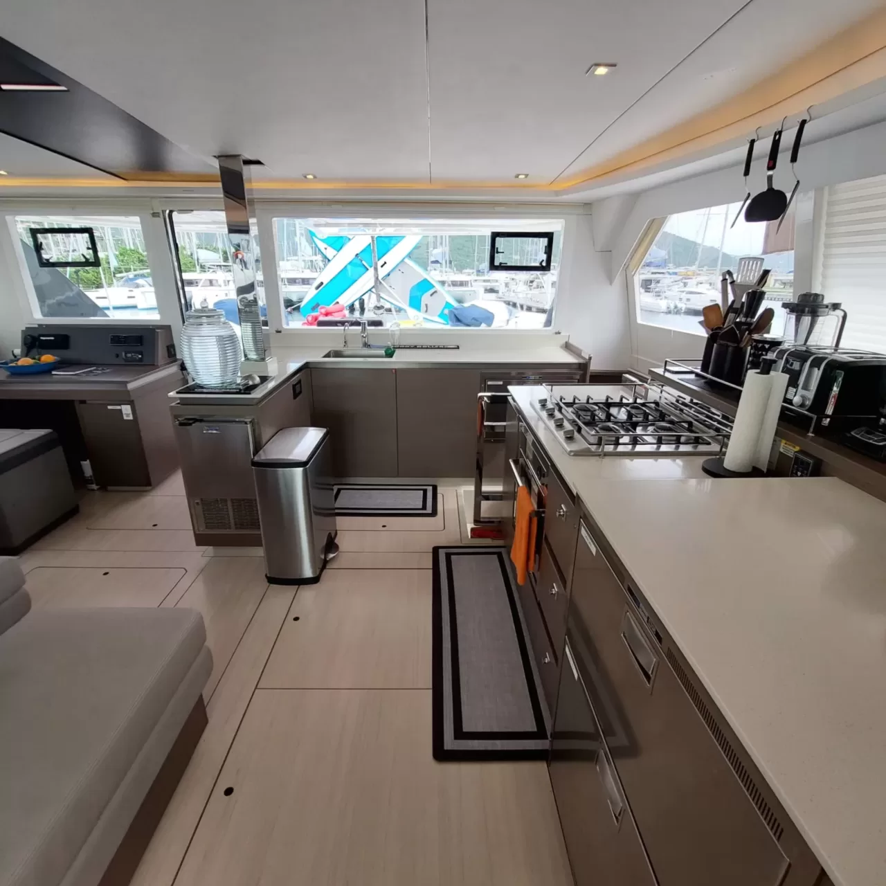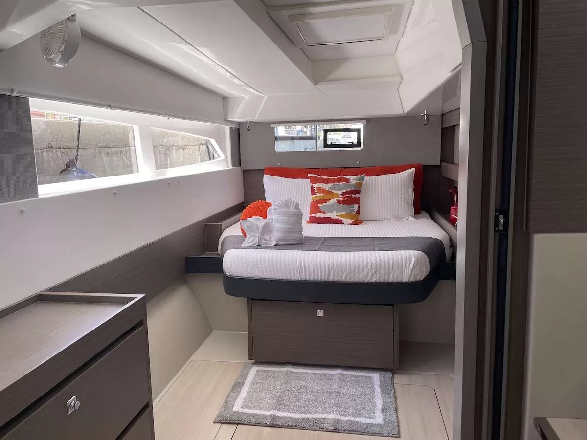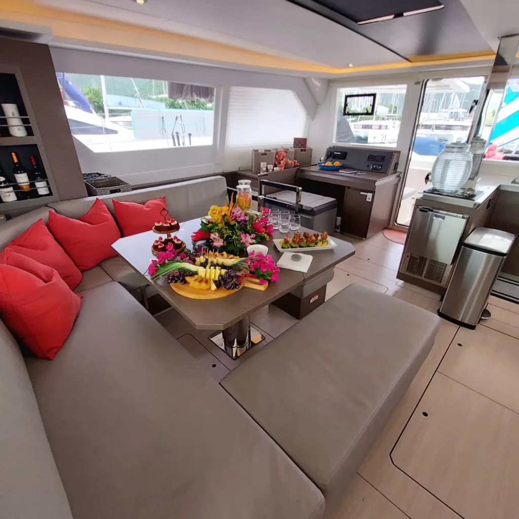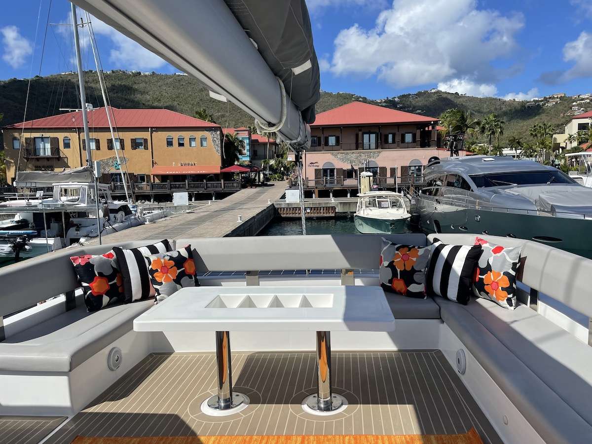 The salon combines elegance and functionality with a fully-equipped galley, nav station, formal dining area, and a lounge that opens to both the front cockpit and aft deck, creating a seamless indoor-outdoor living space. Whether enjoying the Caribbean breeze or the comfort of air conditioning, guests can relax in style throughout the yacht.