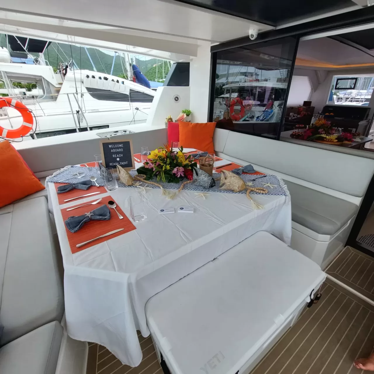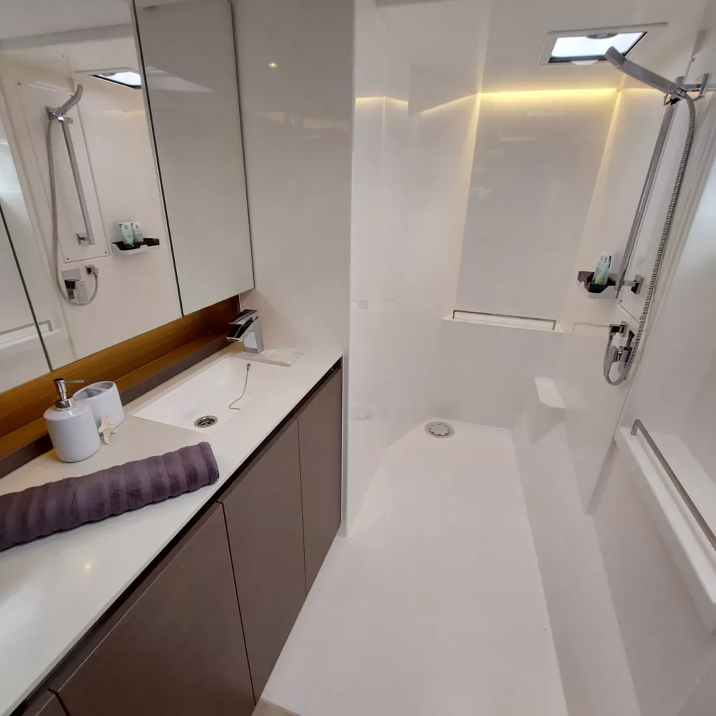 Head to the flybridge lounge for panoramic views, a sunbed, seating, and a table for sunset cocktails or alfresco dining. REACH blends modern design, spacious social areas, and luxurious accommodations with personalized service from the professional crew, ensuring a memorable and indulgent sailing experience in the Caribbean.