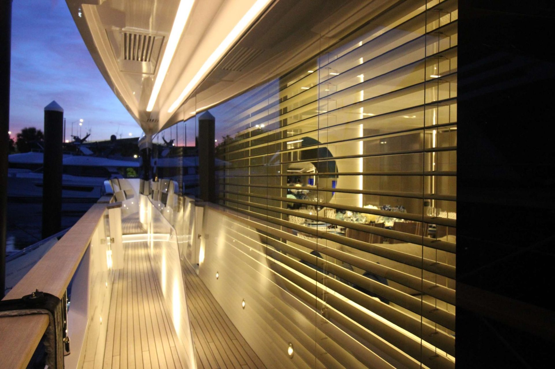 The sundeck is designed for relaxation and entertaining, complete with a jacuzzi, bar, dining table, and a hardtop roof that opens electronically to let in the sun and sea breeze. The aft deck features an air-conditioned dining area with a table and sun pad, providing a comfortable space to dine or unwind while enjoying the surrounding views.